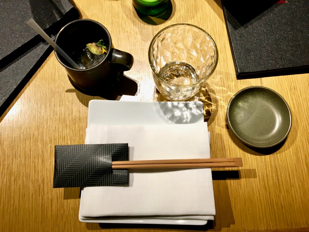You know these uber-trendy bars in movies? Where Will Smith hangs out in Hitch or Emily Blunt would go to in the Devil Wears Prada (some serious cinematographic references going on here…)? This is exactly how Chotto Matte looks like when you enter. Everybody is polished and beautiful, the lights are dimmed, the music is trendy and slightly too loud, the interior decor is edgy, and in the middle there is me… Looking slightly dishevelled with a runny nose after a walk across cold windy London.